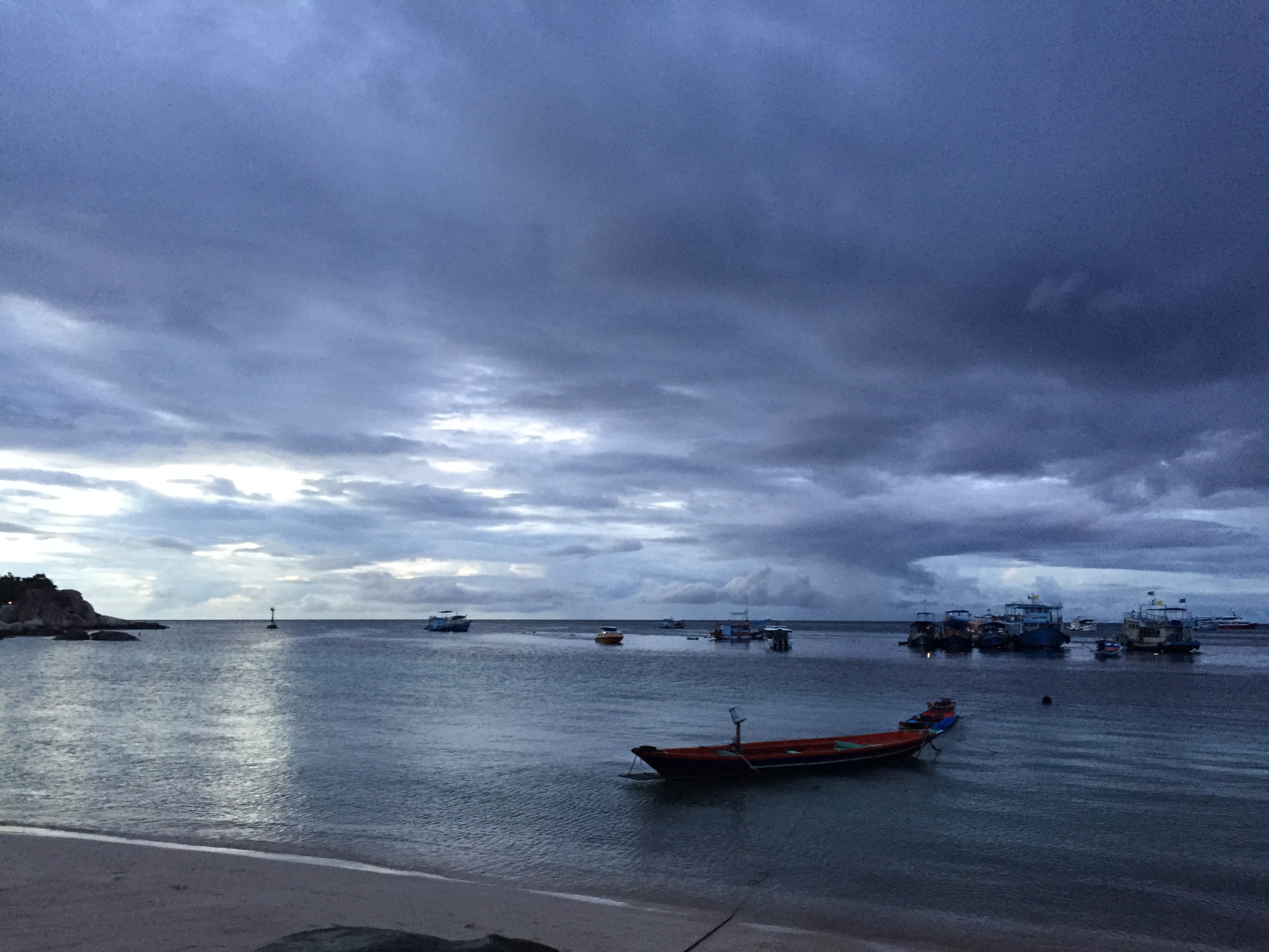 Dimanche au calme sur l’île de la tortue. Nous avons changé de spot hier ! Pendant les premiers jours à Koh Tao, nous étions logés au coeur de la foule. Les marchés, les restaurants, les magasins de vêtements et les boutiques de babioles s’entassaient sur le bord des routes. C’était merveilleux. Je place (pour l’instant) ces derniers jours au top de mes instants préférés. J’adore ce genre d’ambiance, surtout la nuit. J’aime savoir que dehors, peu importe quand je sortirai, ce sera plein de couleurs, de senteurs, de gens, d’animaux, de vie(s). J’aime sortir et croiser le chemin d’autres êtres humains quand les rues ne sont éclairées que par les lampions rafistolés, dont les abat-jours sont des noix de coco (déco spéciale thaïlandaise !).